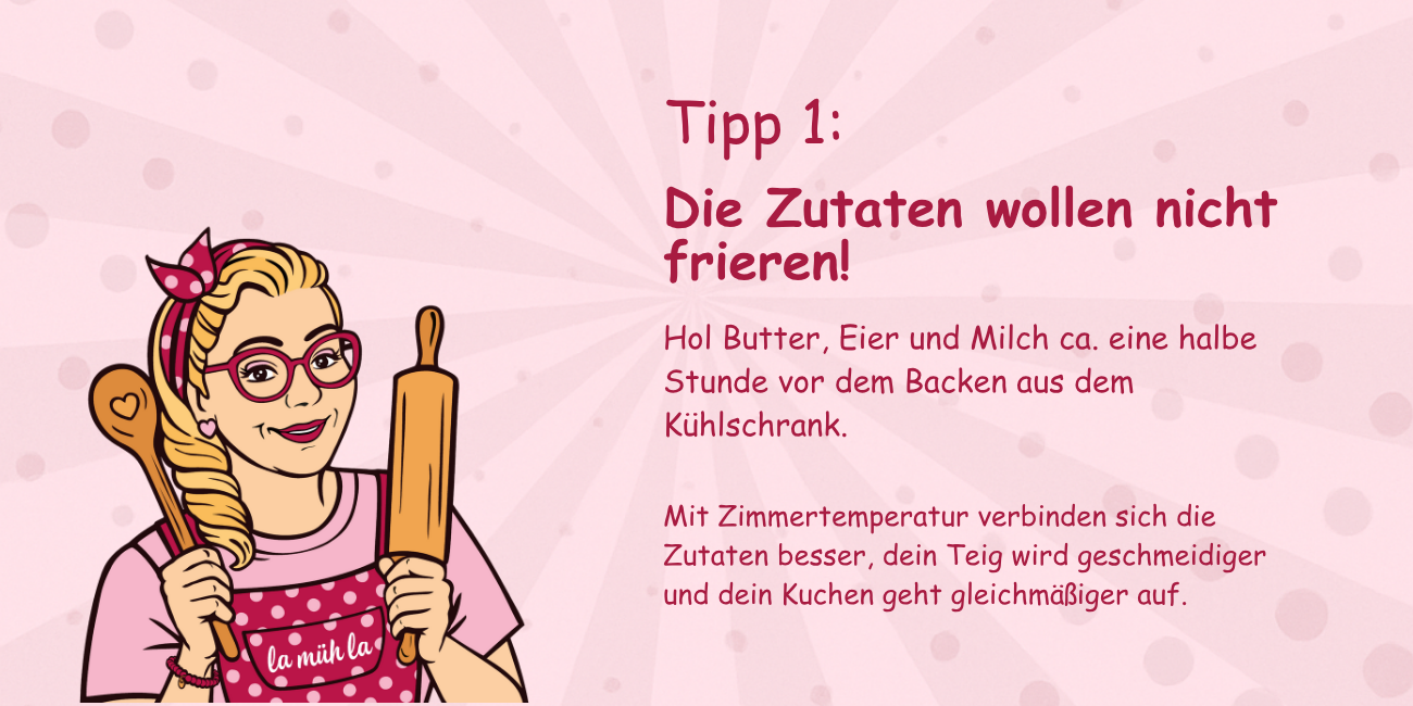 Mit Zimmertemperatur verbinden sich die Zutaten besser, dein Teig wird geschmeidiger und dein Kuchen geht gleichmäßiger auf.