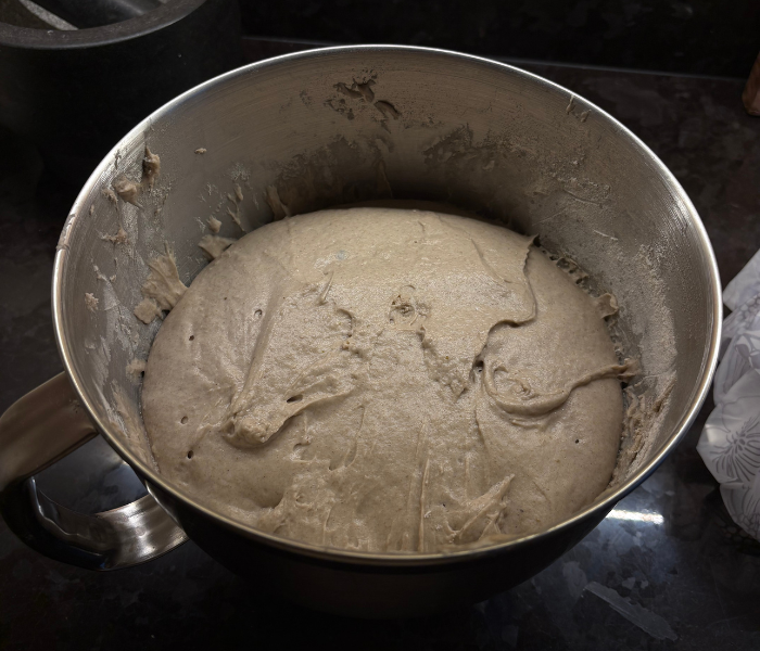Den Vorteig lässt du etwa 8 Stunden bei Raumtemperatur ruhen. In dieser Zeit sollte er schön aufgehen und aktiv werden – dann ist er bereit für den nächsten Schritt.